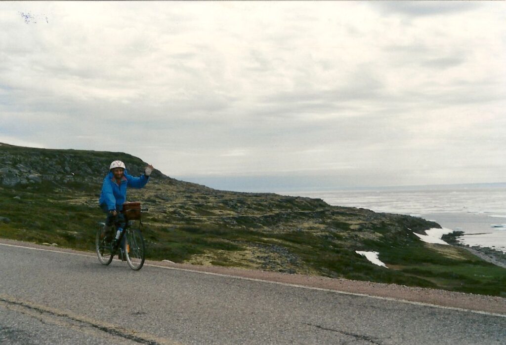 Enfin, Terre-Neuve ! Quelques derniers ajustements, et nous voilà partis. Lyette finit par retrouver confiance en son vélo et en elle. Le convoi chambranlant prend la route. Nous laissons Jean au coin de la route.