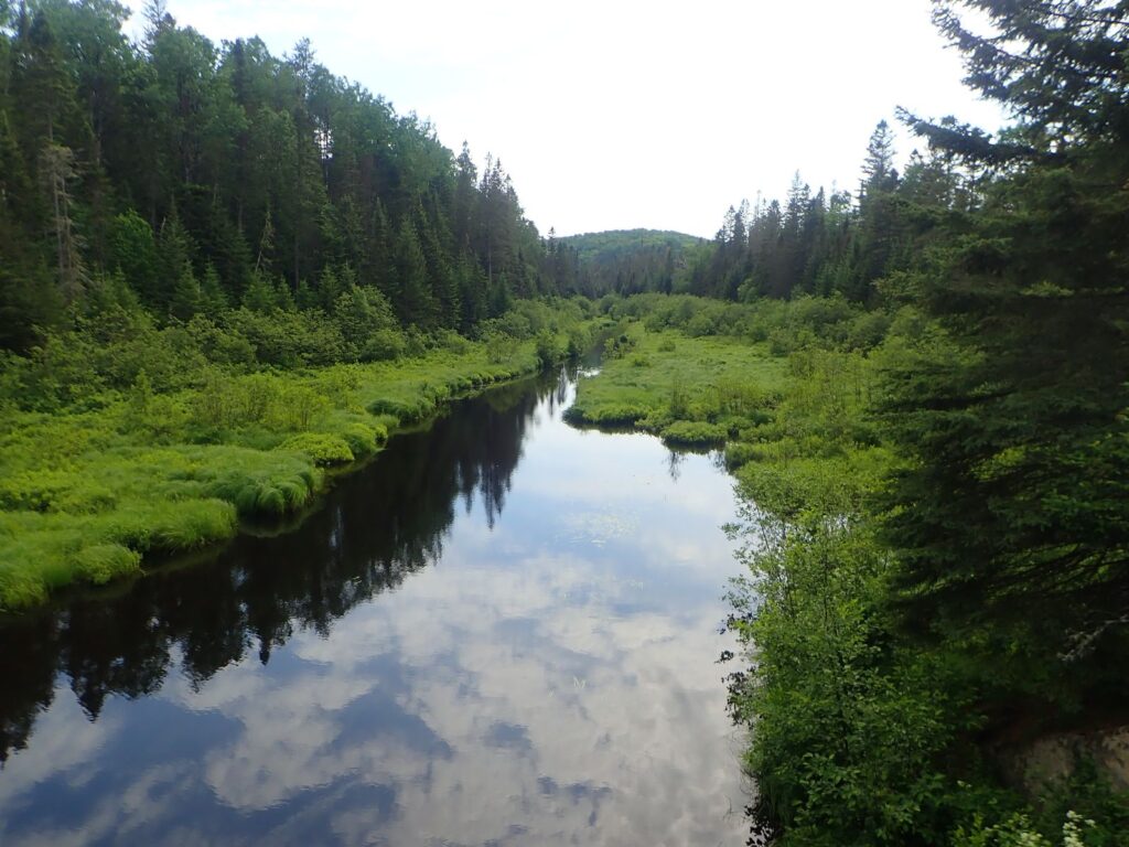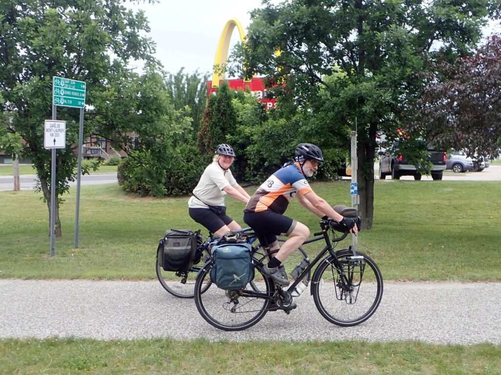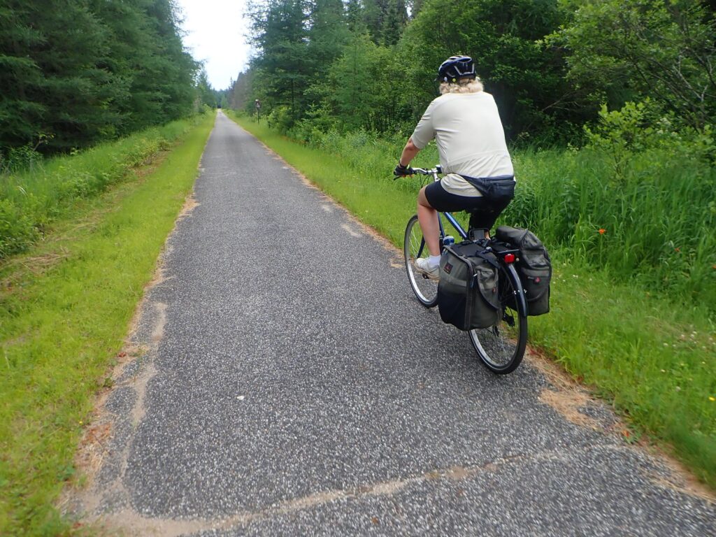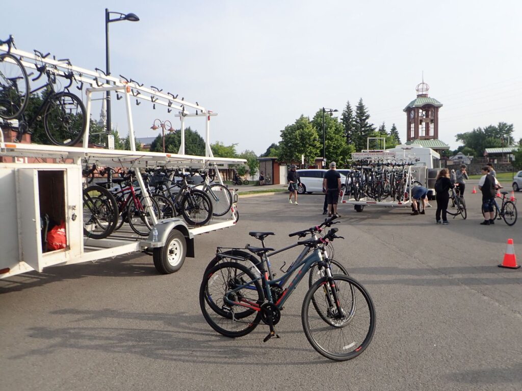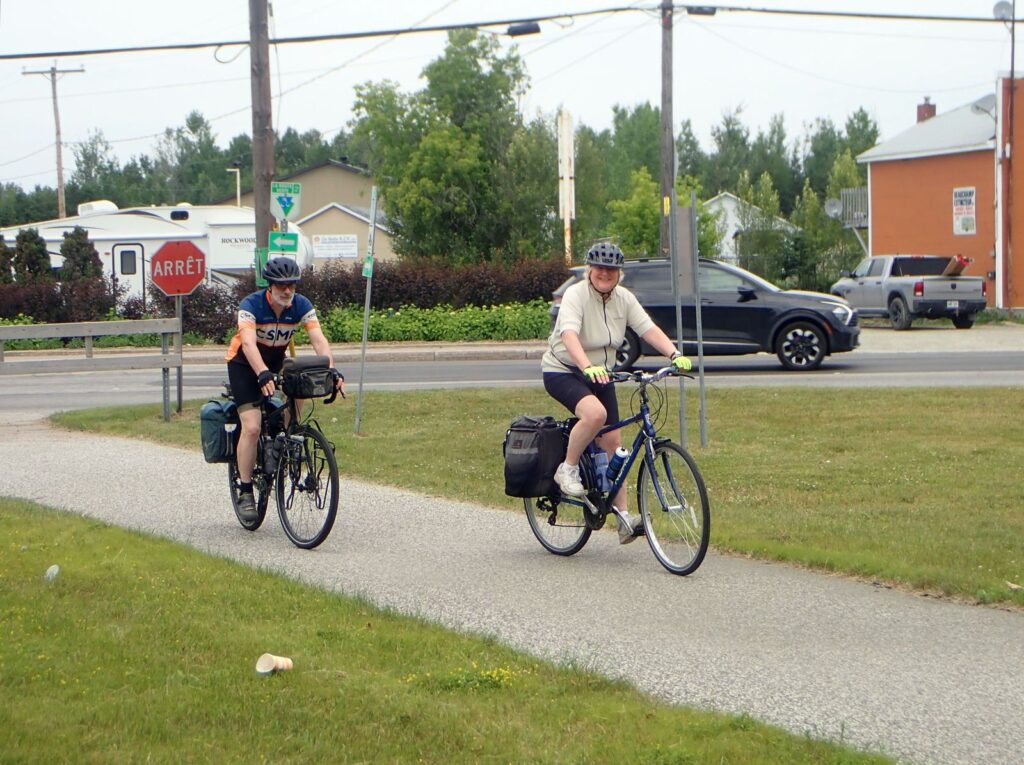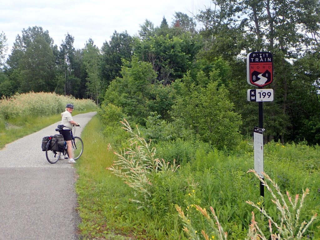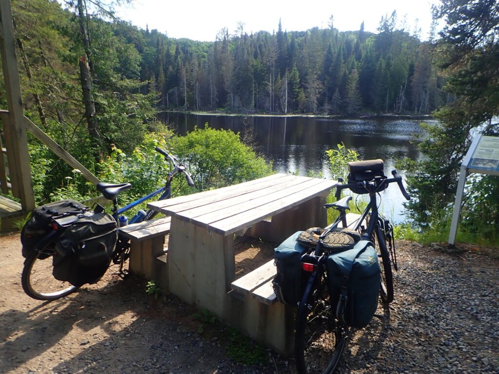 Nuit calme et confortable, grâce aux fenêtres bien ouvertes de notre chambre de motel juste au nord de Saint-Jérôme. Mais le réveil sonne tôt : nous sommes debout à 6 h et à la gare à 7 h. Il y a deux petits autobus avec chacun une remorque pour les vélos, et les cyclistes qui arrivent tranquillement. À 8 h 15, les deux véhicules sont remplis, nous prenons la route. En chemin, nous arrêtons à Labelle et à Lac Saguay, nous arrivons à Mont-Laurier vers 11 h 15.