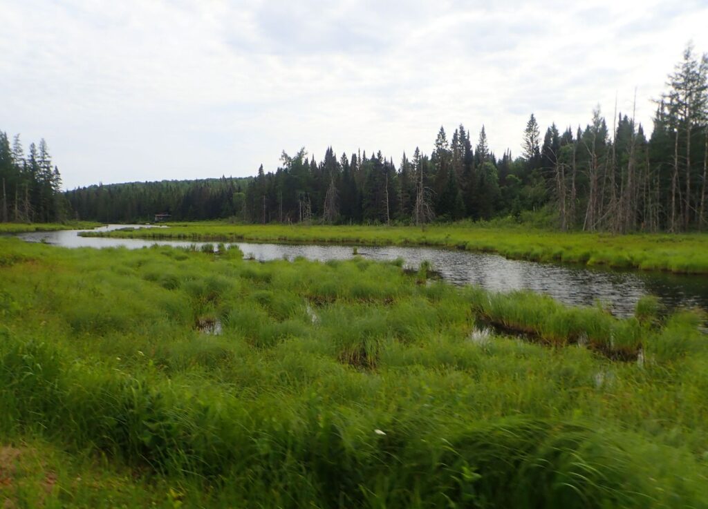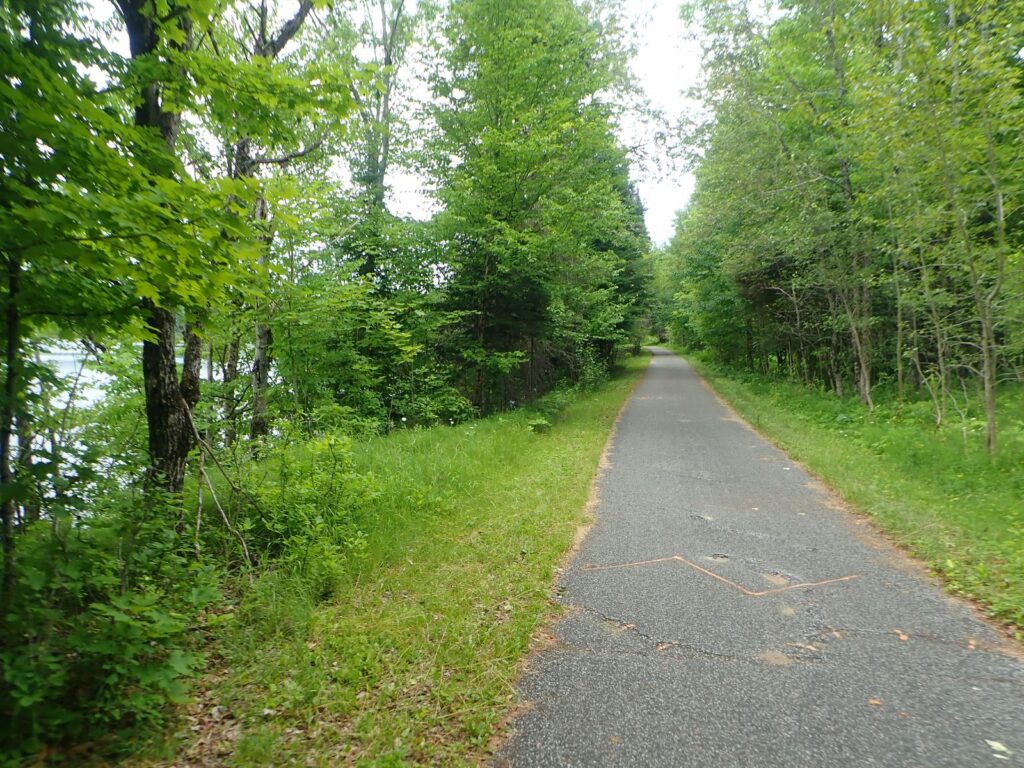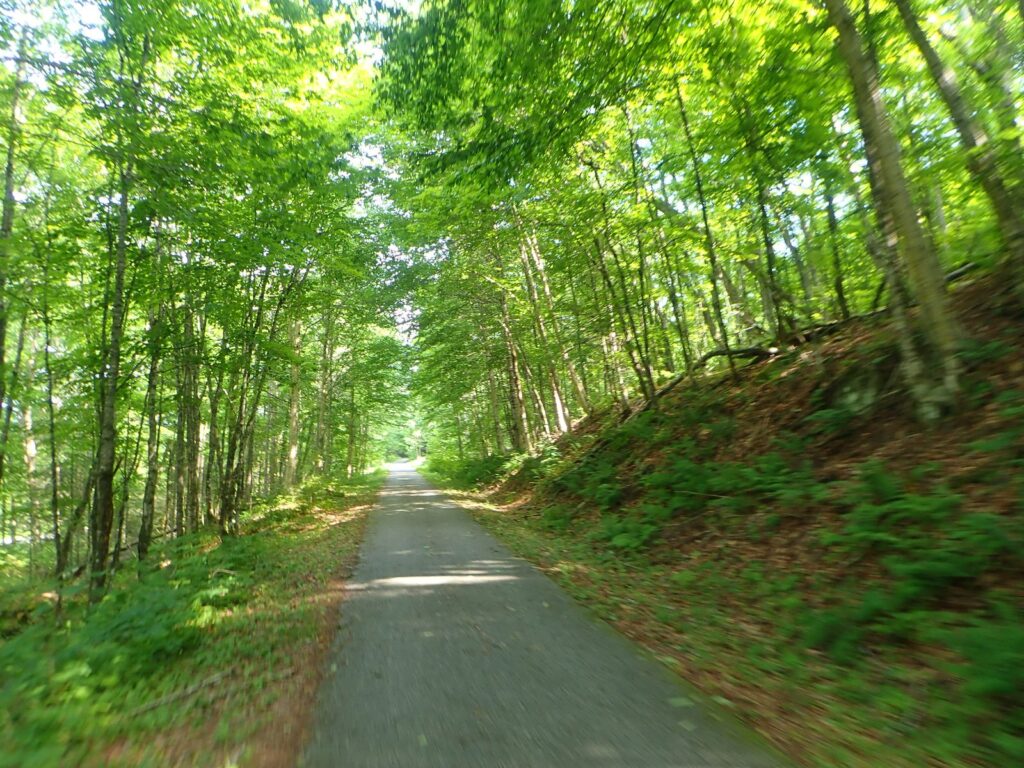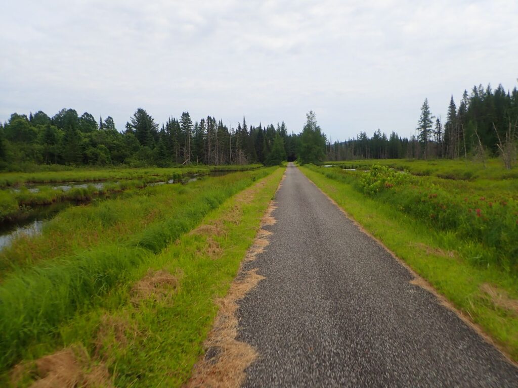À 11 h 40, nous prenons la piste. Côté température, c’est nuageux et confortable. La chaussée est un peu abîmée, mais les défauts sont marqués en rouge. Surtout, nous sommes dans une jolie forêt habitée par de nombreux oiseaux – un bonheur pour Manon l’ornithologue. Nous pique-niquons sur le bord du Lac des Écorces, c’est parfait.