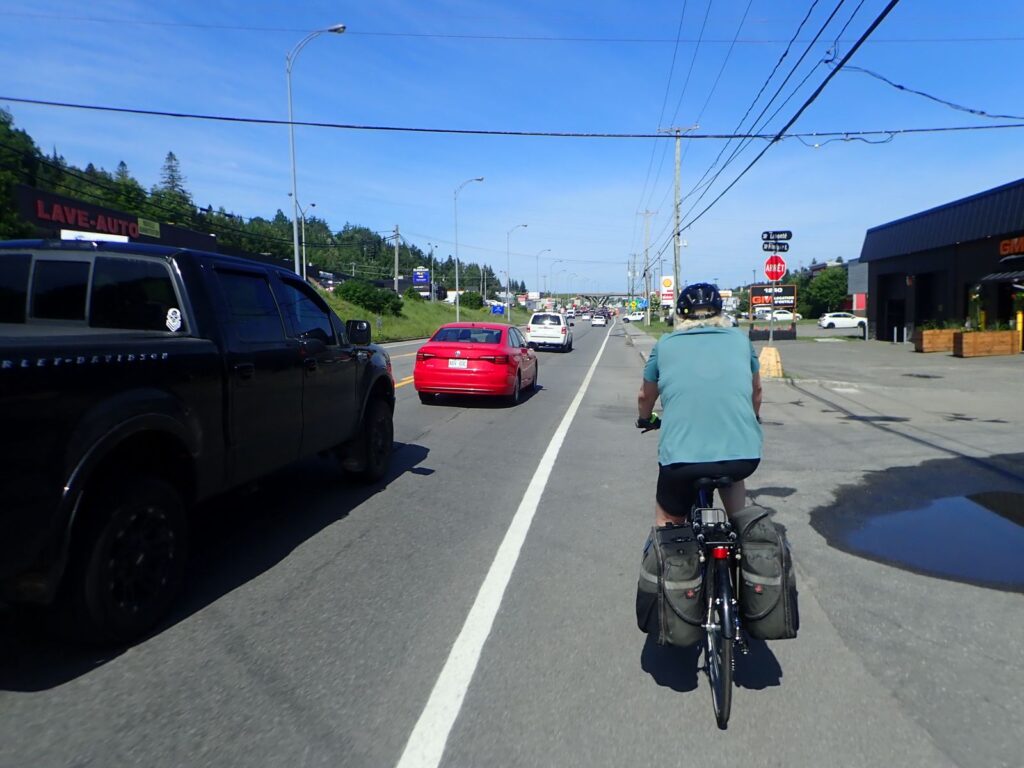 Les premiers mètres se font sur la très passante route 117, toujours sans espace pour les vélos. Roulant derrière Manon, je constate un mouvement anormal de sa roue arrière. Diagnostic rapidement confirmé : un rayon est brisé, la roue est maintenant très fragile.