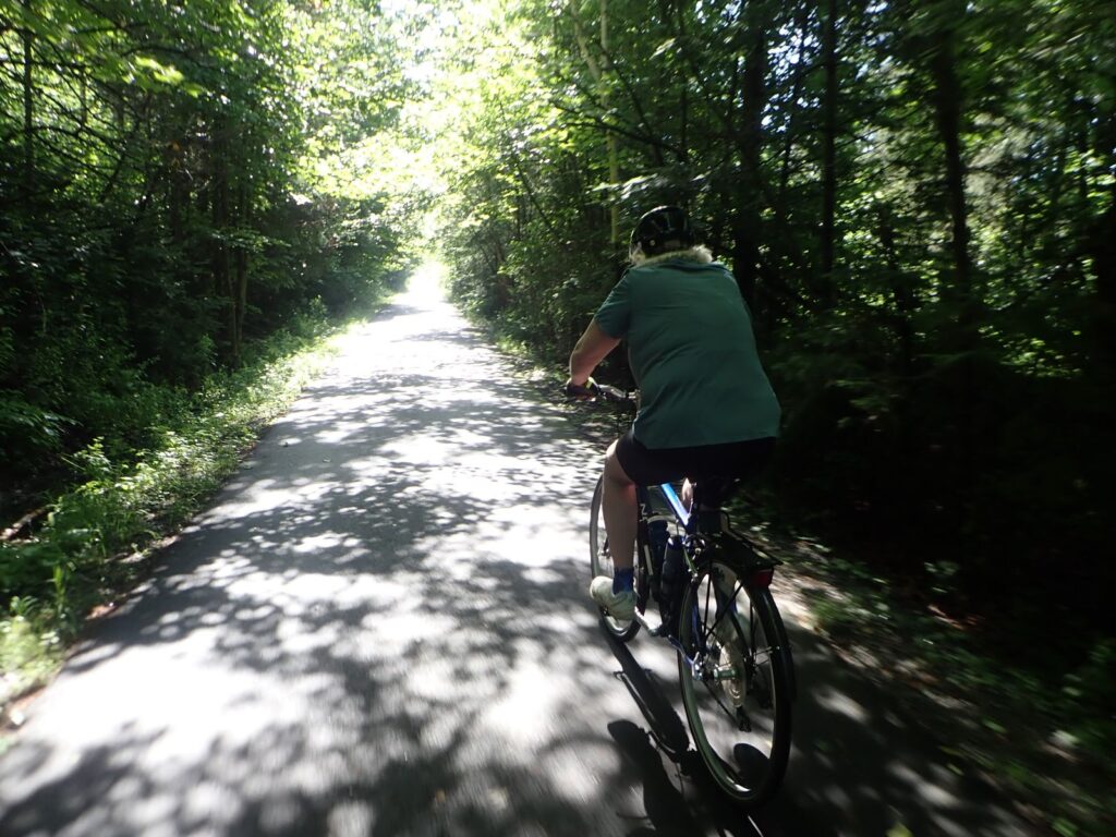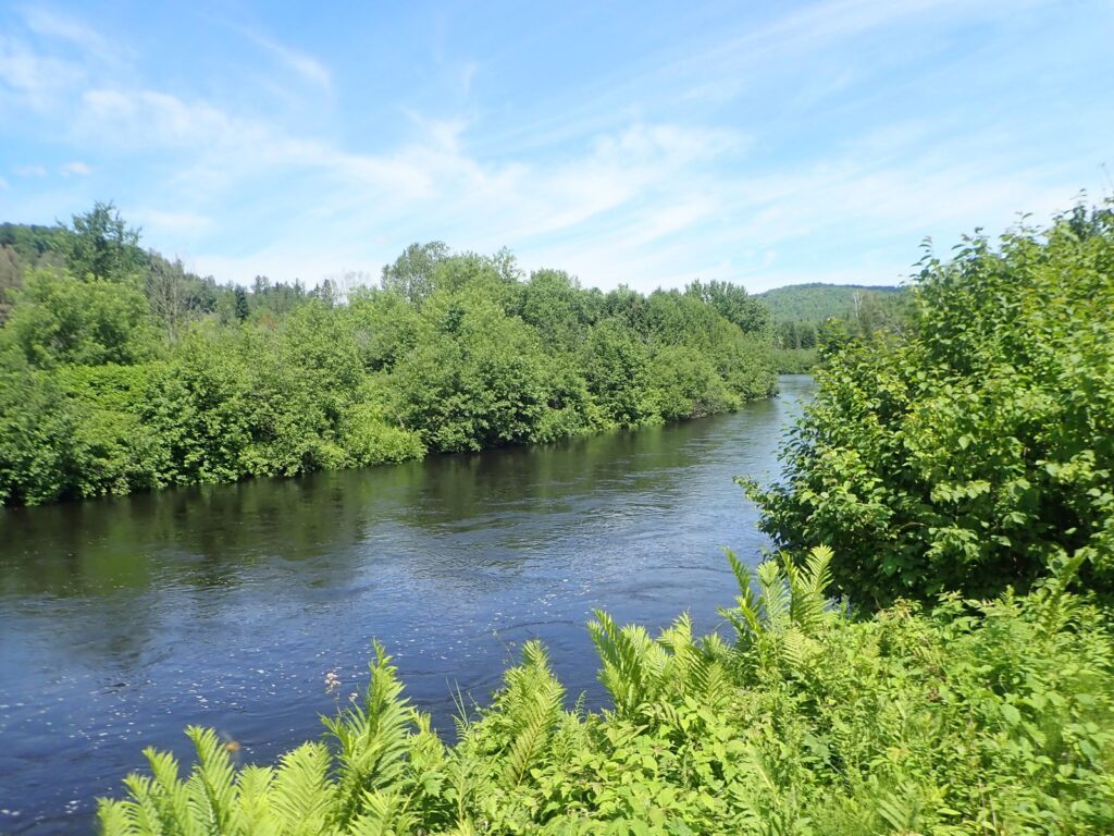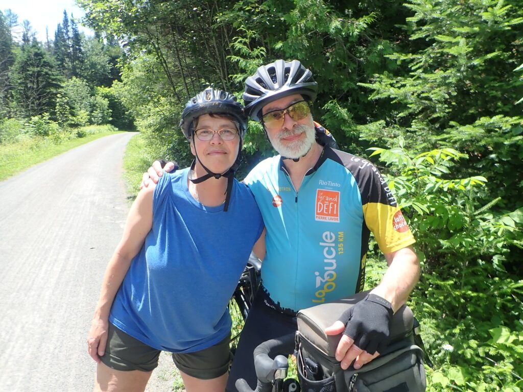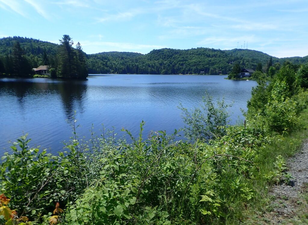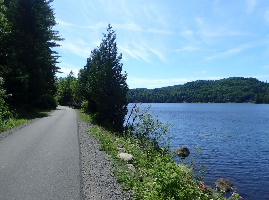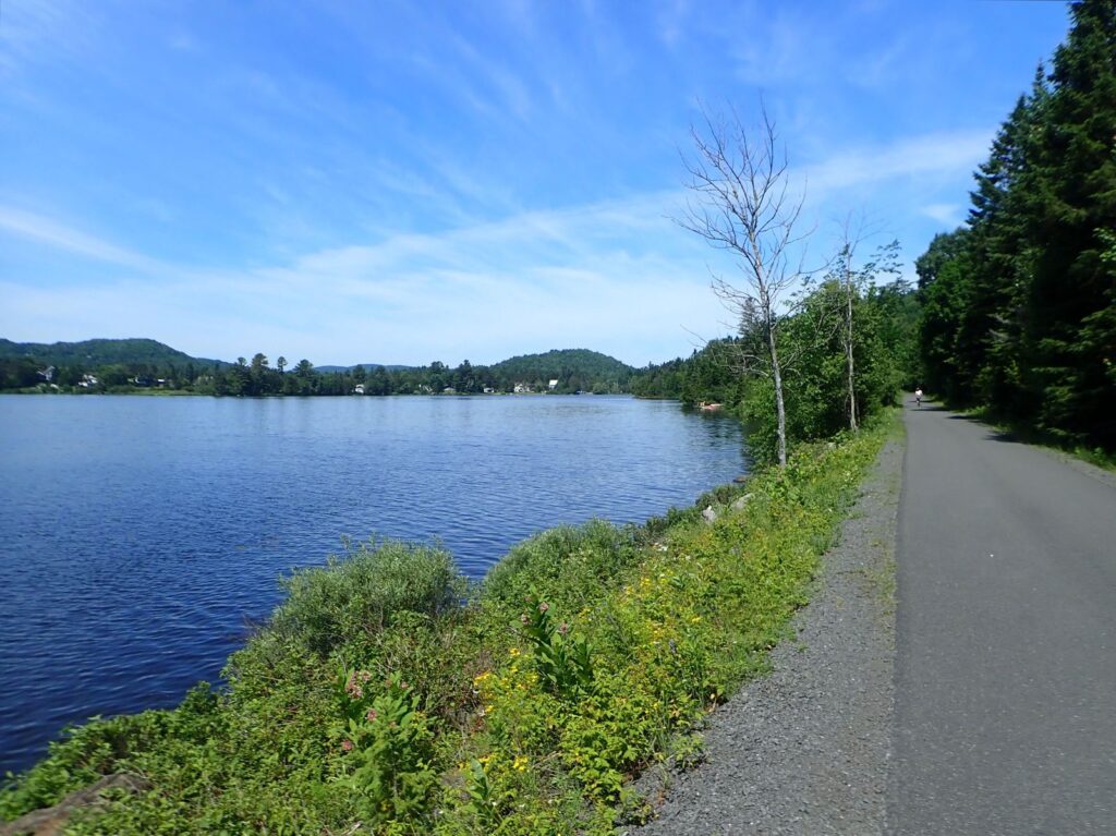 C’est vraiment très joli sous le soleil. Nous longeons le Lac Raymond, puis, assez souvent, la rivière, alors les points de vue se succèdent. Soudain, j’entends crier mon prénom par des gens que je croise. Nous nous arrêtons : c’est ma cousine Christiane et son conjoint Paul qui prennent l’air avec leurs vélos électriques. Belle rencontre !