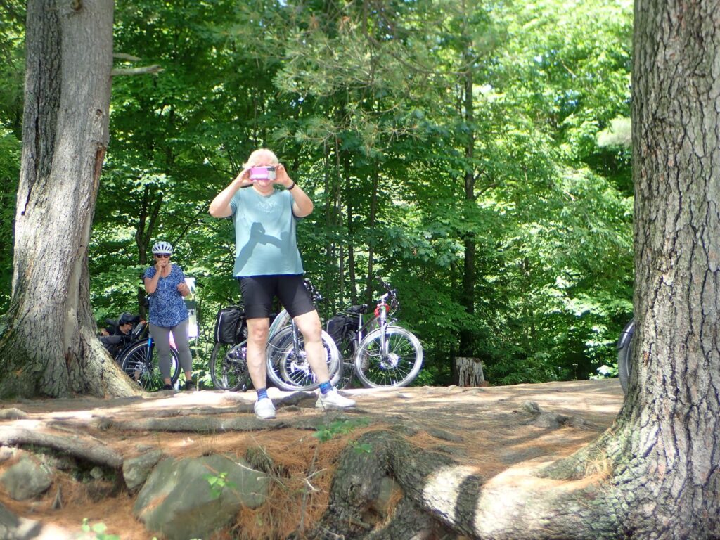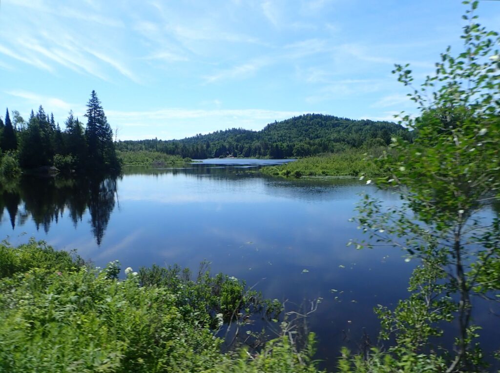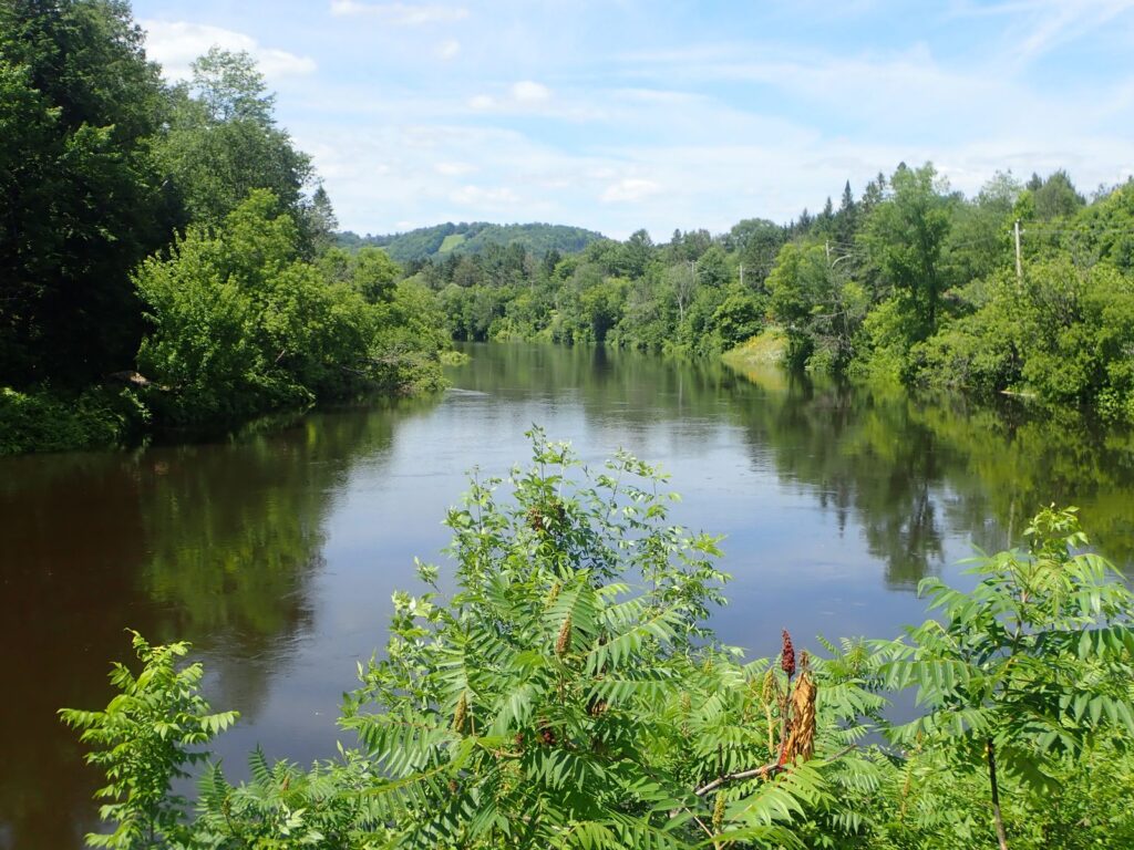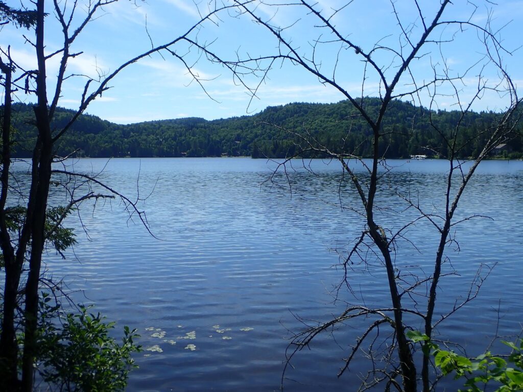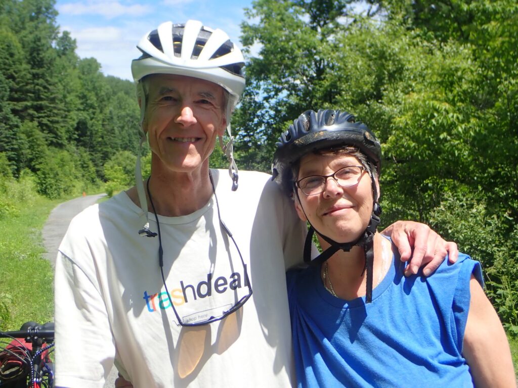 C’est vraiment très joli sous le soleil. Nous longeons le Lac Raymond, puis, assez souvent, la rivière, alors les points de vue se succèdent. Soudain, j’entends crier mon prénom par des gens que je croise. Nous nous arrêtons : c’est ma cousine Christiane et son conjoint Paul qui prennent l’air avec leurs vélos électriques. Belle rencontre !