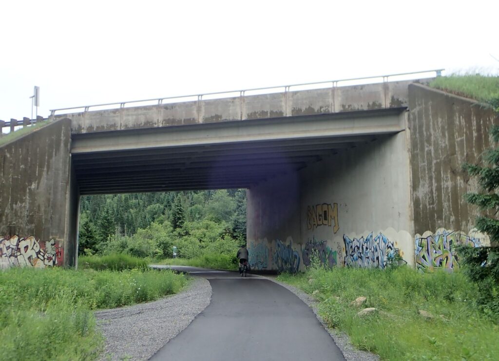 Cyclotouriste de longue date, je viens enfin de parcourir Le Parc linéaire interprovincial Petit Témis qui relie Edmunston NB à Rivière-du-Loup Qc, une magnifique balade vélo de 134 km. Mais les gens de la région évitent une partie de la piste, car il y a un os.
