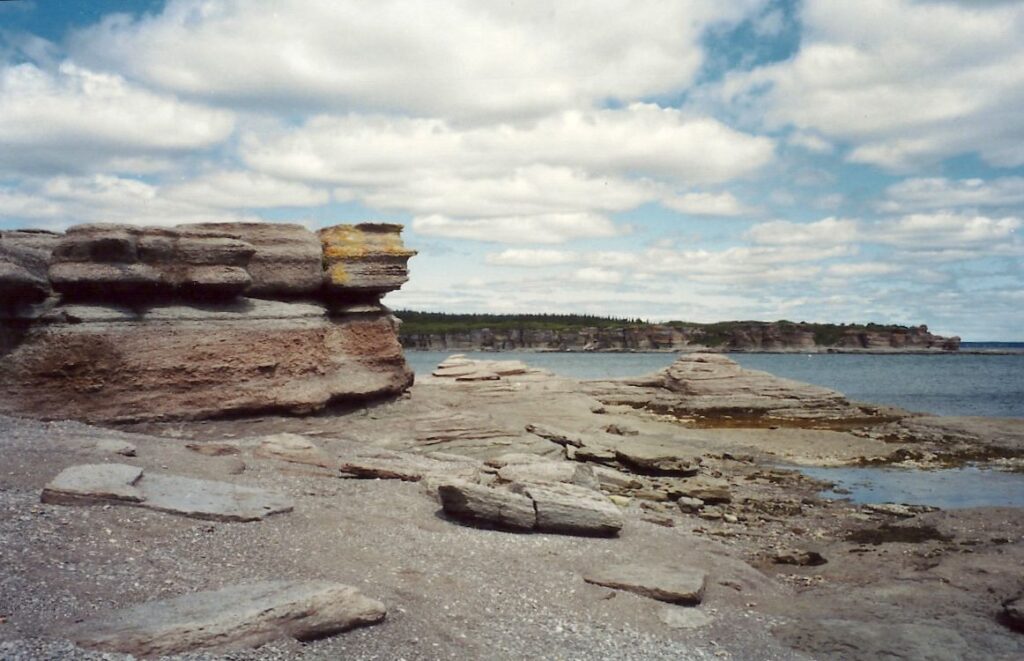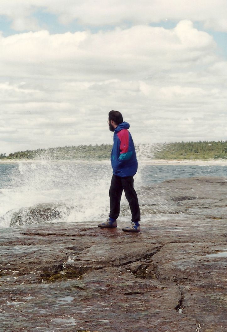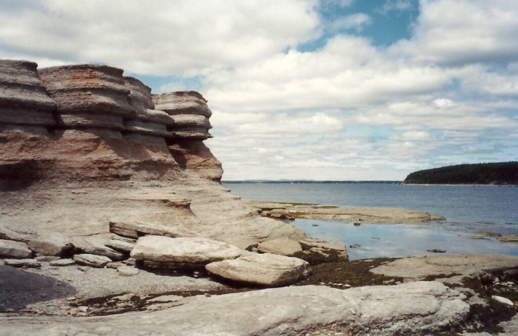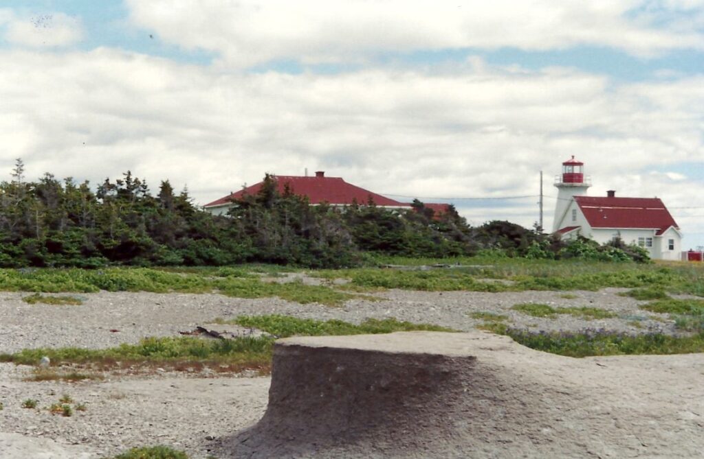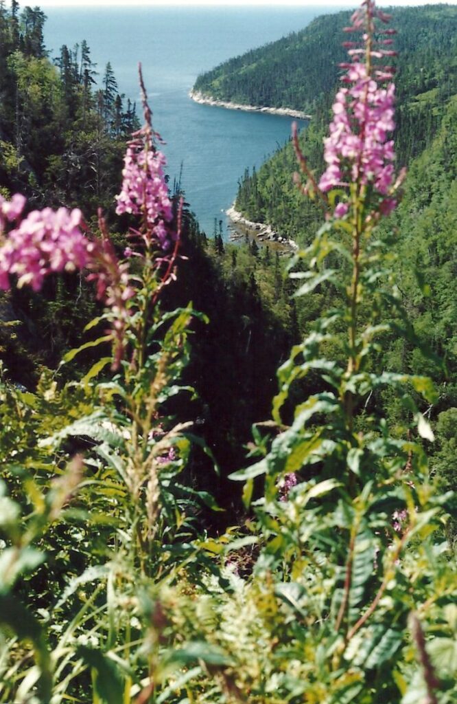 Un petit arrêt sur le bord d’un lac et d’un précipice nous aide à apprécier nos derniers beaux points de vue de la mer sur la Côte Nord. Nous arrivons à Tadoussac sous la pluie. À Baie-Ste-Catherine, un diner « enchanteur » sur la galerie d’un immeuble qui ressemble à une école calme nos estomacs affamés. Mais pour les besoins d’évacuation, petit problème, il n’y a pas de toilettes, même à la Caisse Populaire. Le détour au restaurant du coin est obligatoire et peu apprécié. Roger et Jacinthe ne font pas ce détour et empruntent le chemin du sous-bois. Rien ne va plus quand nous décidons de partir, croyant Roger et Jacinthe aux toilettes du restaurant, alors qu’ils sont dans les bois. Nous les apercevons juste à temps. Nous ne partirions quand même pas sans eux.