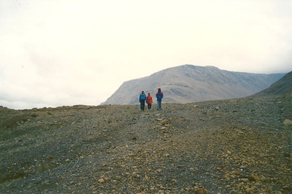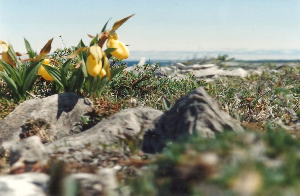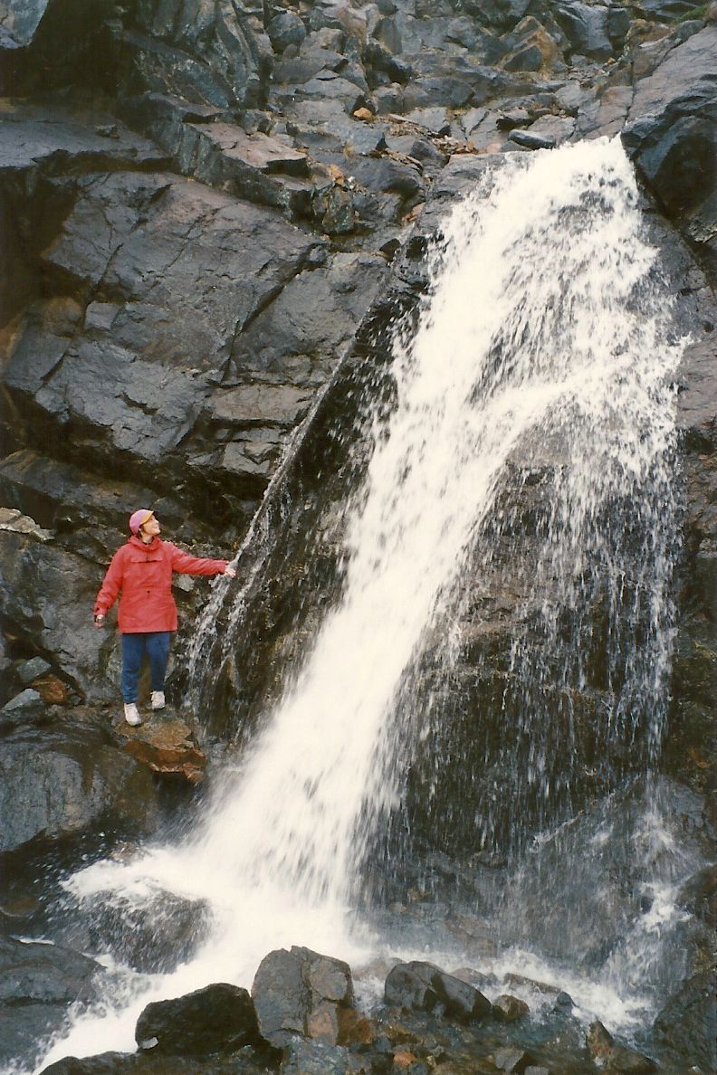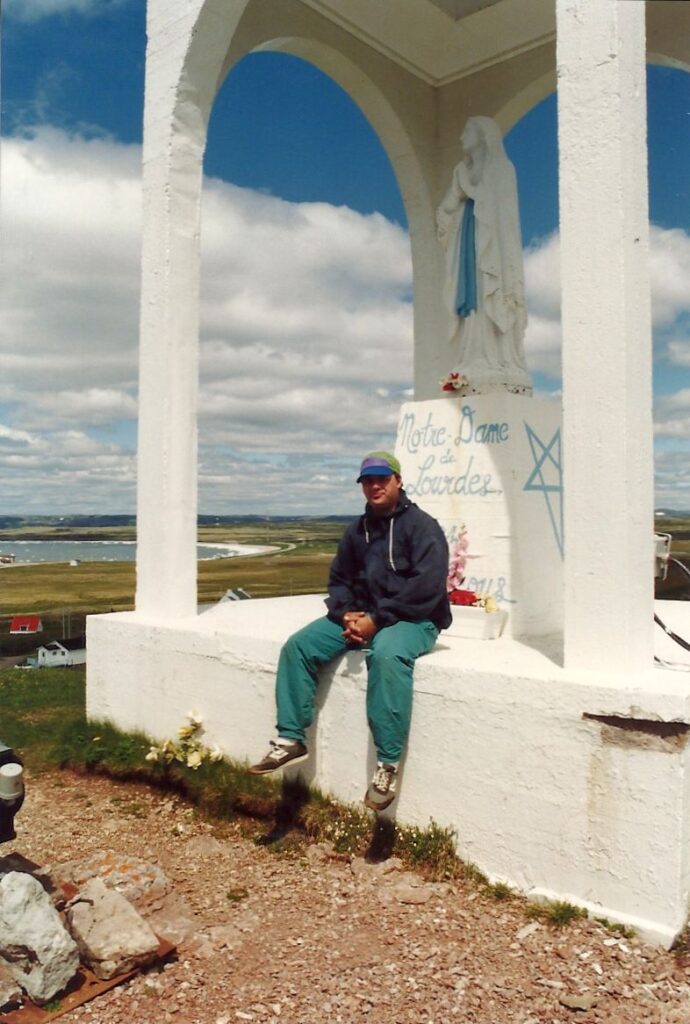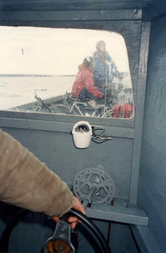Un petit arrêt sur le bord d’un lac et d’un précipice nous aide à apprécier nos derniers beaux points de vue de la mer sur la Côte Nord. Nous arrivons à Tadoussac sous la pluie. À Baie-Ste-Catherine, un diner « enchanteur » sur la galerie d’un immeuble qui ressemble à une école calme nos estomacs affamés. Mais pour les besoins d’évacuation, petit problème, il n’y a pas de toilettes, même à la Caisse Populaire. Le détour au restaurant du coin est obligatoire et peu apprécié. Roger et Jacinthe ne font pas ce détour et empruntent le chemin du sous-bois. Rien ne va plus quand nous décidons de partir, croyant Roger et Jacinthe aux toilettes du restaurant, alors qu’ils sont dans les bois. Nous les apercevons juste à temps. Nous ne partirions quand même pas sans eux.